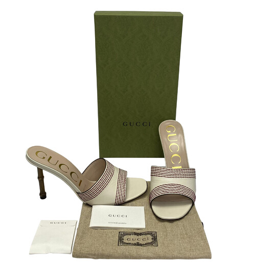 Mule Gucci confeccionado em couro na cor off white com detalhes pespontados em vermelho. O modelo traz bico arredondado e salto com detalhe em bamboo.