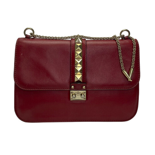 Bolsa Valentino Glam Lock confeccionada em couro na cor vermelha. O modelo de tamanho grande possui alça única de ombro em corrente, que pode ser usada como dupla, detalhe em maxi studs na aba frontal e ferragens douradas. Conta com três bolsos internos sendo um com fecho por zíper e fecho principal por dispositivo de encaixe.