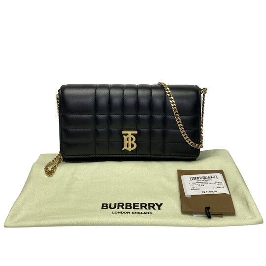 Bolsa Burberry confeccionada em couro na cor preta. O modelo de formato retangular traz alça longa em corrente, ferragens douradas, fechamento por botão de pressão e compartimento único interno.