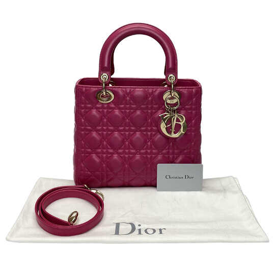 Bolsa Christian Dior Lady Dior. O modelo é confeccionado em couro lambskin rosa com acabamento cannage. Traz alça dupla de mão, outra longa removível e ajustável e compartimento único interno. Fechamento por zíper.