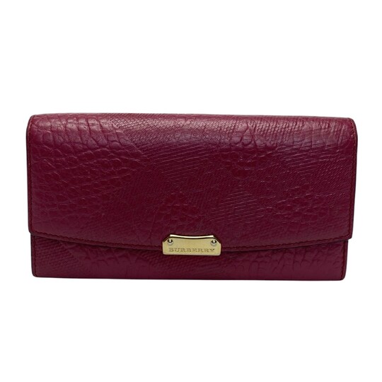 Carteira Burberry confeccionada em couro na cor rosa. Possui modelagem retangular em tamanho médio, três compartimentos na parte interna, sendo um com fechamento por zíper, doze divisórias para cartões, ferragens na cor dourada e fecho por botão de pressão.