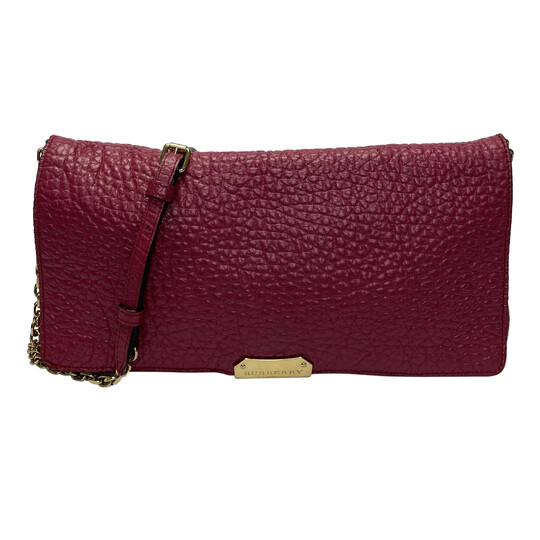 Bolsa Burberry confeccionada em couro na cor rosa. O modelo de formato retangular apresenta alça longa ajustável com detalhe de corrente, ferragens douradas e fecho por botão de pressão.