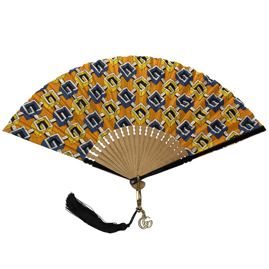 Leque Gucci estampado em tons de azul e amarelo, com detalhe de pingente de logotipo da marca em metal dourado e tassel. Possui estojo de couro.