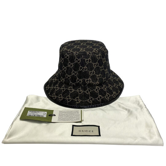 Chapéu Gucci Bucket confeccionado em tecido denin com logotipo da marca GG e acabamentos em couro na cor preta. Tamanho: M (58 cm)