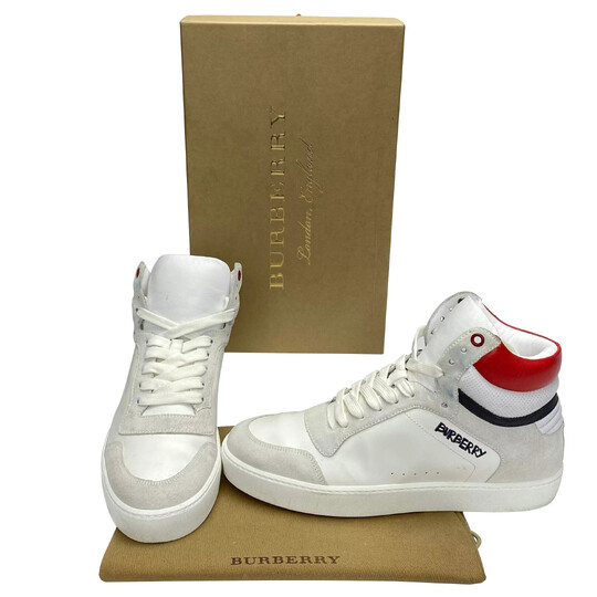 Sneackers Burberry confeccionado em couro na cor branca, com detalhes em nobuck. O modelo de cano alto traz solado emborrachado branco, bico arredondado e fechamento por cadarço.