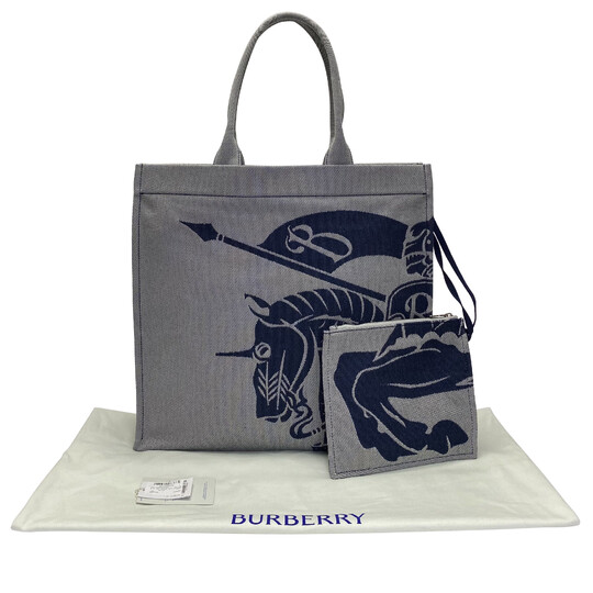 Bolsa Burberry Square Tote confeccionada em canvas cinza com bordado de logotipo da marca em marinho. O modelo de tamanho grande apresenta duas alças de mãos, compartimento único interno e pochete com fecho por zíper.