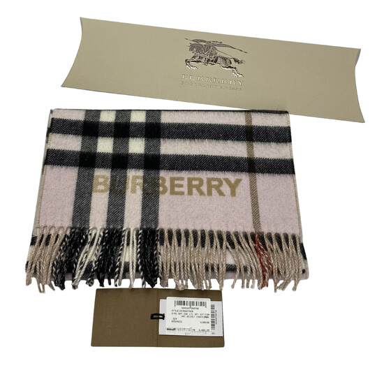 Cachecol Burberry confeccionado 100% em cashmere. O modelo dupla face é feito de um lado em tons de rosa, preto e bege, e no outro, em bege, preto e vermelho, no tradicional xadrez da marca.