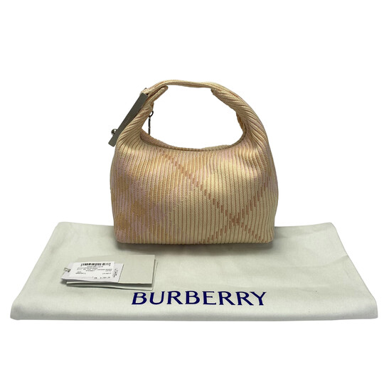 Bolsa Burberry Duffle Peg Mini confeccionada em algodão misto em tons de rosa, nude e bege, em padronagem xadrez vintage. O modelo possui alça de mão única, fechamento por zíper na parte superior e compartimento principal.
