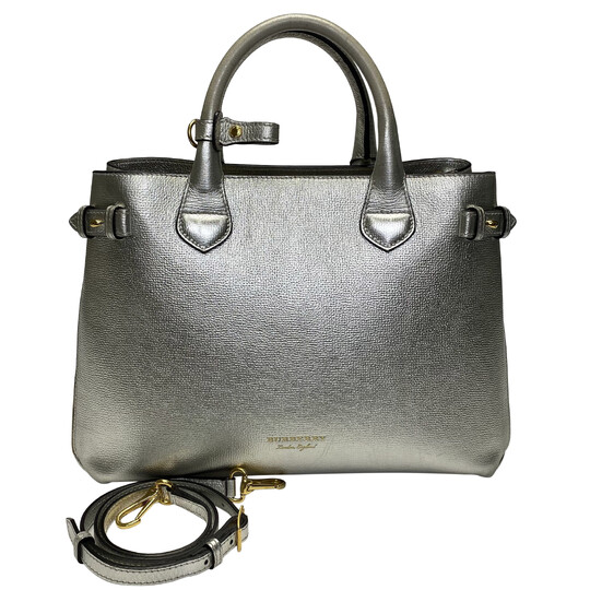 Bolsa Burberry Banner confeccionada em couro metalizado com laterais em tecido estampado com xadrez típico da marca. O modelo possui alça dupla de mão estruturada, alça longa ajustável e removível por mosquetão, três compartimentos internos sendo o central com fecho em zíper, ferragens prateadas e fecho por botão magnético.
