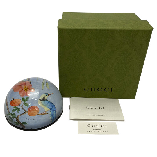 Peso de Papel Gucci confeccionado em vidro com interior estampado de pássaro e flores.