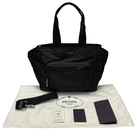 Bolsa Prada Tote Baby confeccionada em nylon na cor preta. O modelo de tamanho grande, apresenta duas alças de mão e outra de ombro ajustável e removível. Com ferragens prateadas e fechamento principal por zíper, possui três bolsos interno, um externo na parte frontal e dois nas laterais. Traz logo da marca em metal dourado.