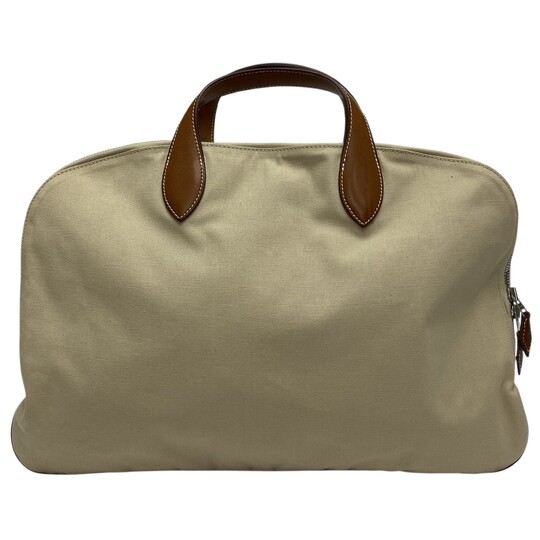 Bolsa Hermès Victoria Travel Briefcase. O modelo é confeccionado em canvas na cor bege e possui acabamentos em couro caramelo. Com duas alças de mão, apresenta ferragens prateadas e fechamento por zíper.