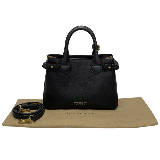 Bolsa Burberry Banner confeccionada em couro na cor preta. O modelo de tamanho pequeno traz laterais em tecido estampado com xadrez típico da marca. Possui alça dupla de mão estruturada, alça longa ajustável e removível por mosquetão, três compartimentos internos sendo o central com fecho em zíper, ferragens douradas e fecho por botão magnético.