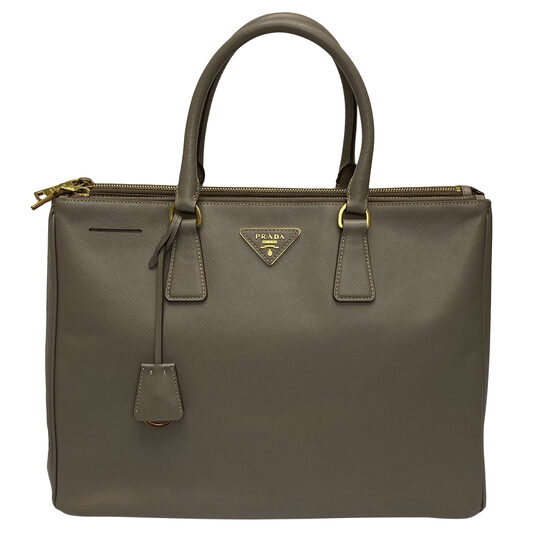 Bolsa Prada Galleria confeccionada em couro saffiano na cor cinza. O modelo retangular possui três compartimentos internos sendo o central com fecho em zíper. Conta com alça dupla de mão, ferragens douradas, botões laterais para ajuste e nome da marca na parte frontal.
