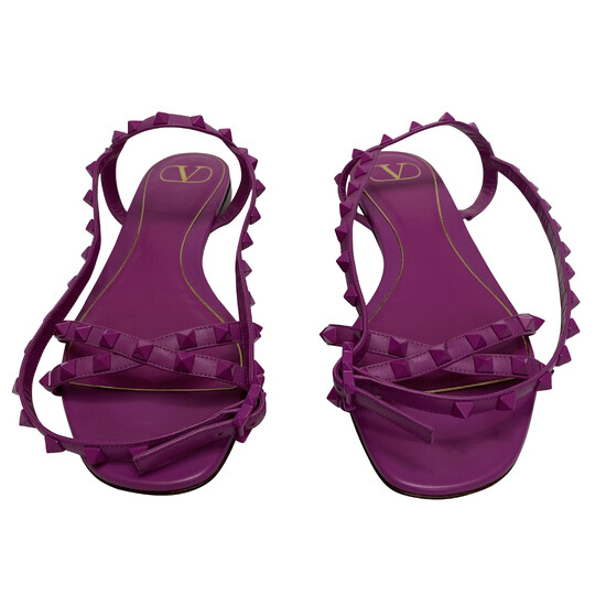 Sandália Valentino Garavani confeccionada em couro na cor pink. O modelo traz detalhe de studs e fechamento por fivela.