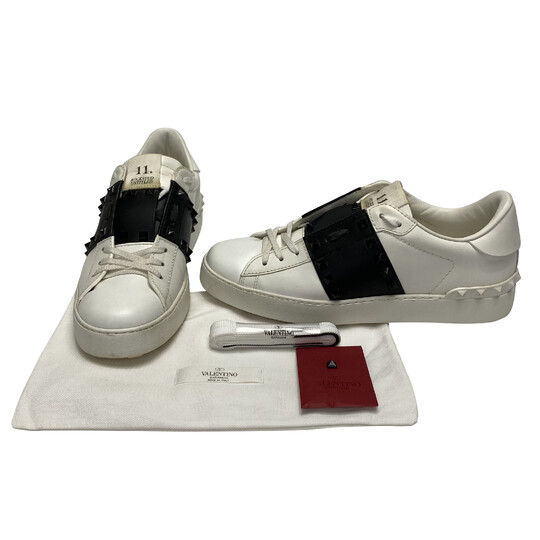 Tênis Valentino Garavani confeccionado em couro na cor branca com detalhes em preto. O modelo traz fechamento frontal por amarração, bico arredondado, solado emborrachado e detalhe rockstud na parte detrás.