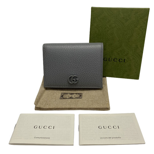Carteira Gucci GG confeccionada em couro na cor cinza. O modelo de tamanho pequeno traz quatro compartimentos internos para cartões, um com zíper para moedas e dois para documentos no geral. Possui logotipo da marca aplicado na parte frontal.