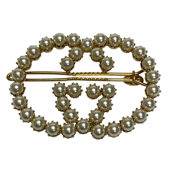 Presilha de Cabelo Gucci confeccionada em metal dourado com aplicação de pérolas sintéticas.