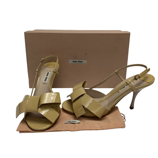 Sandália Miu Miu Verniz Bege Laço Moda plus size original brechó desapego desapego de luxo segunda mão second hand usado usado e bom estado conservado bolsas usadas bolsas segunda mao etiqueta unica enjoei peguei bode bolsas conservadas cansei vendi troca de luxo