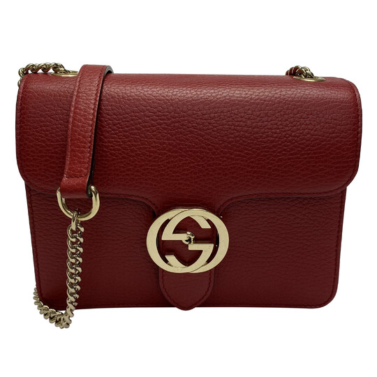 Bolsa Gucci Interlocking G confeccionada em couro na cor vermelha. O modelo estruturado possui alça em corrente longa de ferragem champagne, dois compartimentos internos, um bolso e fecho principal em aba com fivela GG.