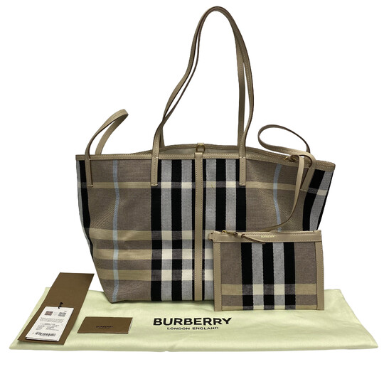 Bolsa Burberry Beach Tote Dusty Sand confeccionada em canvas no tradicional xadrez da marca com acabamentos em couro nude. O modelo de tamanho grande traz alça dupla de ombro, ferragens douradas e fecho por tira com encaixe e botão de pressão. Possui pochete interna com zíper.