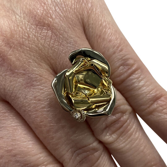 Anel HStern Flor Jardim Mirabeli. O modelo que faz parte da coleção Giverny é confeccionado em ouro amarelo e nobre 18k com detalhe de gavinhas em diamantes cognac.