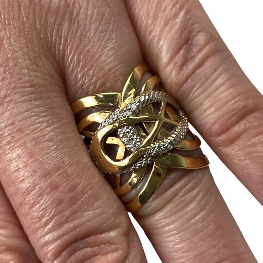 Anel Vivara integrante da coleção Entrelace. O modelo é confeccionado em ouro amarelo 18k com detalhes em ouro branco e 0.12 ct de diamantes. Aro: 15.