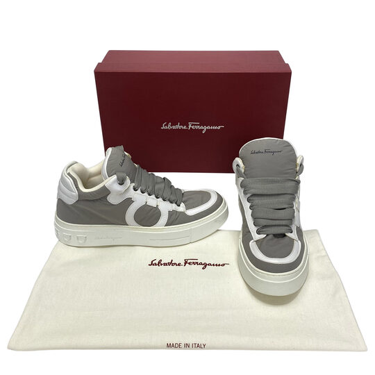 Tênis Salvatore Ferragamo Marvelous3 Couro Branco e Nylon Cinza Moda plus size original brechó desapego desapego de luxo segunda mão second hand usado usado e bom estado conservado bolsas usadas bolsas segunda mao etiqueta unica enjoei peguei bode bolsas conservadas cansei vendi troca de luxo