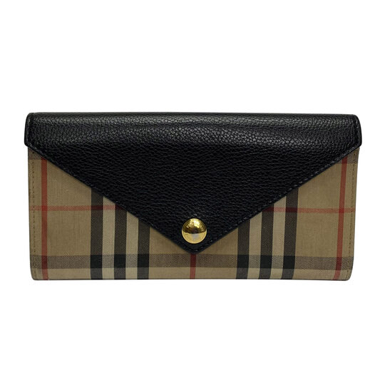 Carteira Burberry confeccionada em couro na cor preta com acabamentos em canvas no tradicional xadrez da marca. O modelo traz diversos espaços para cartões e um compartimento fechado por zíper. Ferragens douradas.