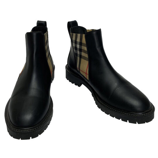 Bota Burberry Chelsea confeccionada em couro na cor preta com detalhe em canvas no tradicional xadrez da marca. O modelo de cano curto possui solado tratorado e bico arredondado.