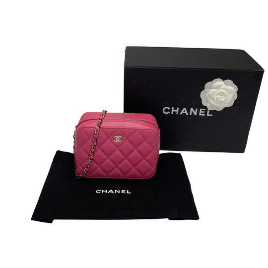 Bolsa Chanel Camera Bag confeccionada em couro caviar na cor rosa com acabamento matelassê. O modelo possui alça longa de ombro entrelaçada com couro, ferragens douradas e fecho principal por zíper.