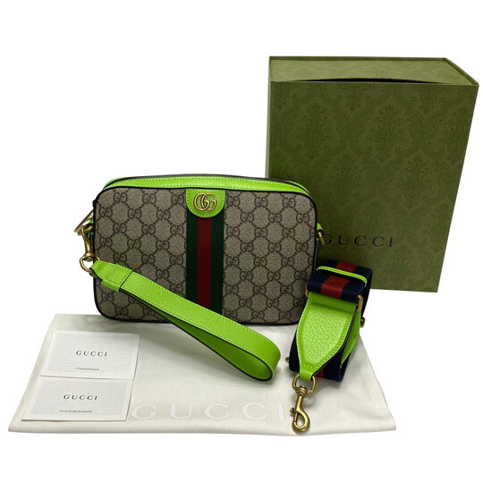 Bolsa Gucci Ophidia Messenger feita em canvas GG suprema com acabamentos em couro verde neon. O modelo de formato retangular traz uma alça de ombro Sylvie Web removível, logo double G dourado, compartimento principal e fechamento por zíper.