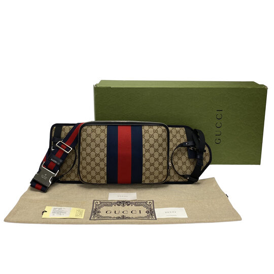 Porta-Skate Gucci confeccionado em canvas com estampa GG da marca, acabamentos em couro preto e faixa web vermelha e azul. O modelo traz bolso com zíper e alça ajustável.