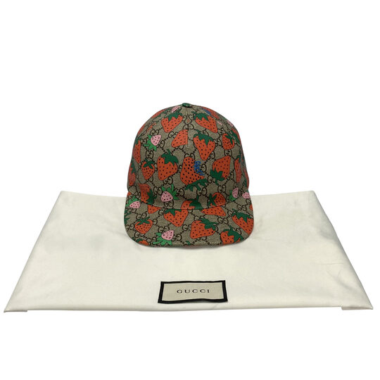 Boné Gucci confeccionado em canvas com estampa de logotipo da marca e desenhos de morangos. O modelo possui acabamentos em couro rosa. Tamanho: M (57 cm)