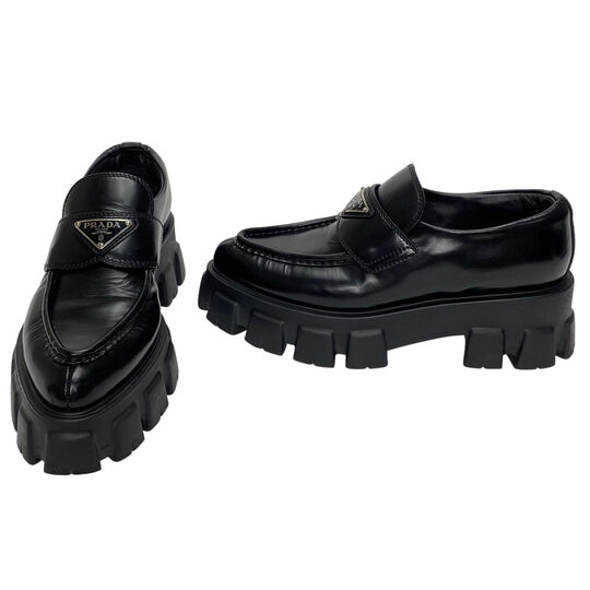 Mocassim Prada Monolith confeccionado em couro na cor preta com detalhe de acabamento com pespontos. O modelo traz solado grosso emborrachado, salto bloco médio, bico arredondado e logo triangular esmaltado.