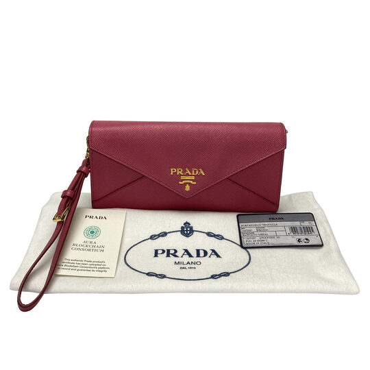Carteira Prada confeccionada em couro saffiano rosa. O modelo traz em seu interior seis espaços para cartões, bolso externo com zíper e fechamento por botão de pressão. Traz alcinha de mão removível, ferragens douradas e detalhe de logotipo da marca na aba.