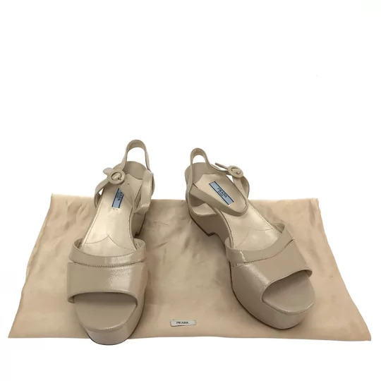 Sandália Prada confeccionada em couro na cor nude. A peça possui salto grosso, duas tiras na frente e outras duas na parte traseira. O fecho é de fivela metálica também na cor nude, na altura do tornozelo.