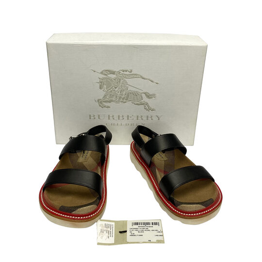 Sandália Infantil Burberry confeccionada em couro nas cores preta e vermelha, revestida em tecido de algodão com xadrez tradicional da marca e fechamento por fivela em metal prateado. O modelo apresenta bico arredondado e solado emborrachado.