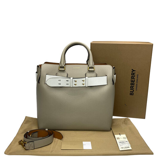 Bolsa Burberry The Medium confeccionada em couro na cor cinza. O modelo de tamanho grande apresenta duas alças de mão, ferragens douradas, fechamento por fivela e base de apoio.