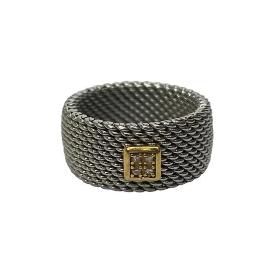 Anel Vivara da linha Power, confeccionado por uma estrutura em aço inoxidável trançado, um case em ouro amarelo 18 quilates e 2 pontos de diamantes com cravação garras.