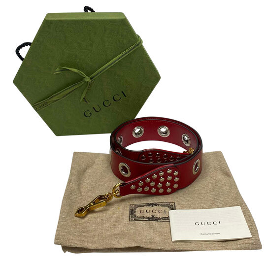 Alça Gucci confeccionada em couro na cor vermelha com detalhe de ilhós prateados. O modelo traz dois mosquetões dourados.