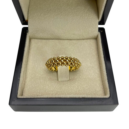 Aliança Carla Amorim Espuma Grossa. Clássica, e confeccionada em ouro amarelo 18k, apresenta bolinhas inspiradas na bela textura que a espuma do mar faz ao voltar da areia. Um trabalho único e artesanal que transformou essa peça em um verdadeiro must have. Acabamento polido. Altura da aliança: 7 milímetros. Aro: 18.