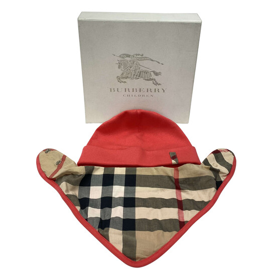 Babador + Touca Burberry confeccionados 100% em algodão coral com detalhes no tradicional xadrez da marca. Tamanho touca: S (48 - 50 cm) / Babador: tamanho único