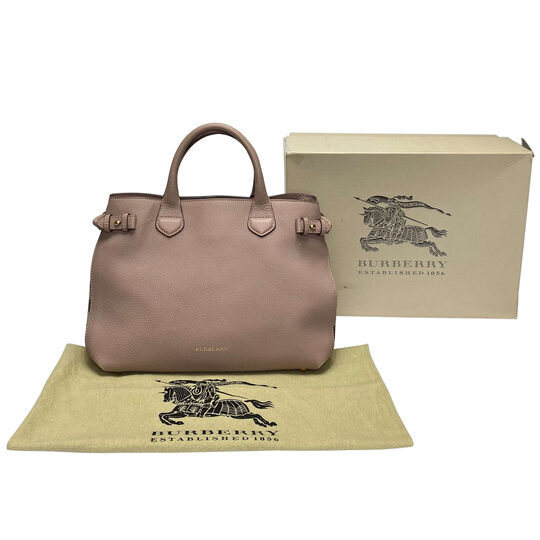 Bolsa Burberry Banner confeccionada em couro na cor rosa com laterais em tecido estampado com xadrez típico da marca. O modelo de tamanho grande possui alça dupla de mão estruturada, alça longa ajustável e removível por mosquetão, três compartimentos internos sendo o central com fecho em zíper, ferragens douradas e fecho por botão magnético.
