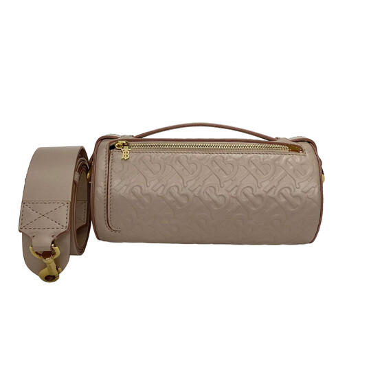 Bolsa Burberry confeccionada em couro na cor nude. O modelo de formato arredondado apresenta alça de mão, alça longa ajustável, ferragens douradas e fechamento por zíper.