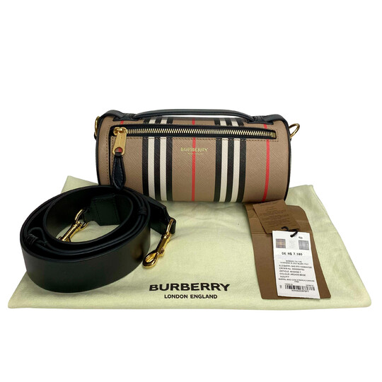 Bolsa Burberry Barrel confeccionada em canvas no tradicional xadrez da marca com acabamentos em couro na cor preta. O modelo de tamanho pequeno e formato arredondado, traz uma alça de mão, outra longa removível e ajustável por mosquetão e ferragens douradas. Apresenta fechamento principal por zíper.