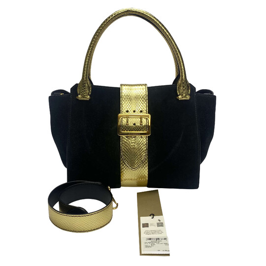 Bolsa Burberry confeccionada em camurça preta, com detalhes em couro píton dourado. O modelo de tamanho grande apresenta duas alças de mão estruturadas, alça de ombro também em píton, removível por mosquetão, fechamento por botão de pressão, fivela dourada e plaquinha em metal com nome da marca na parte frontal. Em seu interior apresenta um compartimento com zíper.