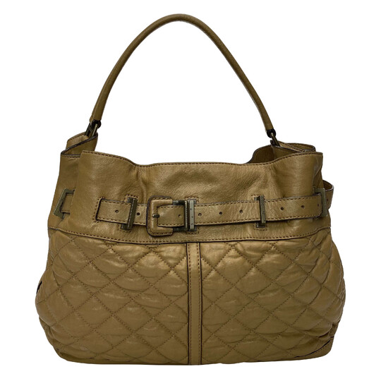 Bolsa Burberry confeccionada em couro na cor caramelo com acabamento matelassê. O modelo de tamanho grande traz uma alça única de ombro, ferragens dourada envelhecidas e fechamento com botão de pressão. Possui detalhe de fivela na parte frontal.