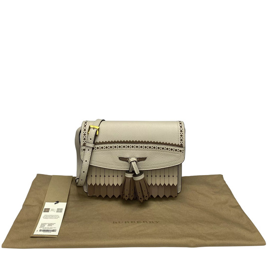 Bolsa Burberry confeccionada em couro na cor nude, com detalhes em marrom. O modelo de formato retangular apresenta alça longa ajustável - que usada por dentro transforma a bolsa em clutch -, dois compartimentos internos, ferragens douradas e bolso externo com zíper na parte detrás. Com fechamento por dispositivo de encaixe, o destaque da peça fica por conta dos dois tassels aplicados na frente.