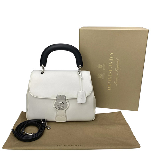 Bolsa Burberry DK88 confeccionada em couro na cor branca. O modelo de tamanho grande possui alça única de mão e alça longa ajustável e removível por mosquetão, ambas em couro preto. Conta com dois bolsos internos, sendo um com fecho por zíper, fecho principal por aba com dispositivo de encaixe e ferragens prateadas.